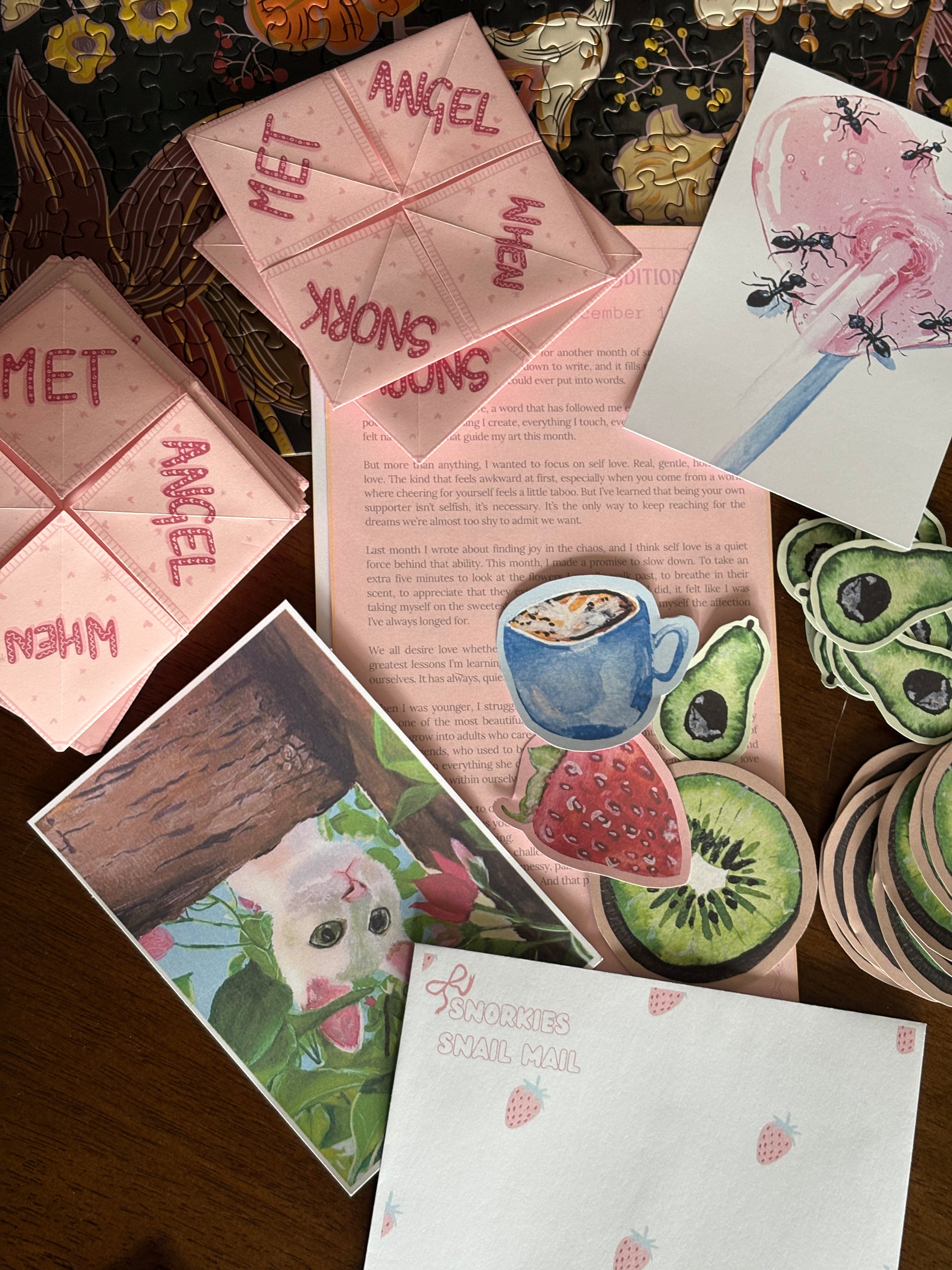 Each month, I create a small collection of printed artwork designed for journaling, collecting, and Sending to penpals. Every piece is printed on high quality paper and made to be used however you want, taped into a notebook, layered in a junk journal, or sent in the mail. There are no rules here, just thoughtful art, once a month.